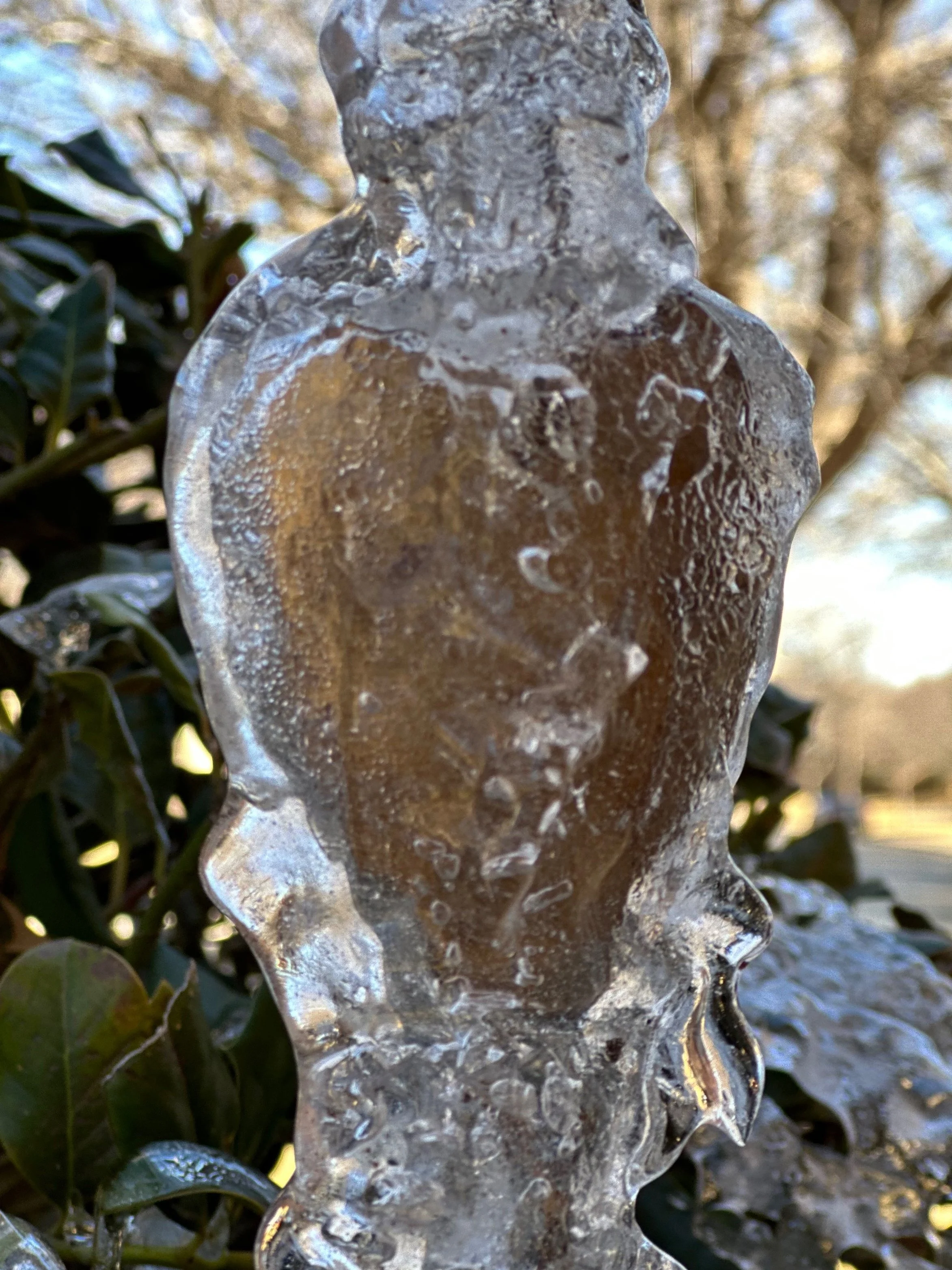 It was one section of our heart shaped rain chain hanging from the gutter above, frozen solid in a coating of ice.