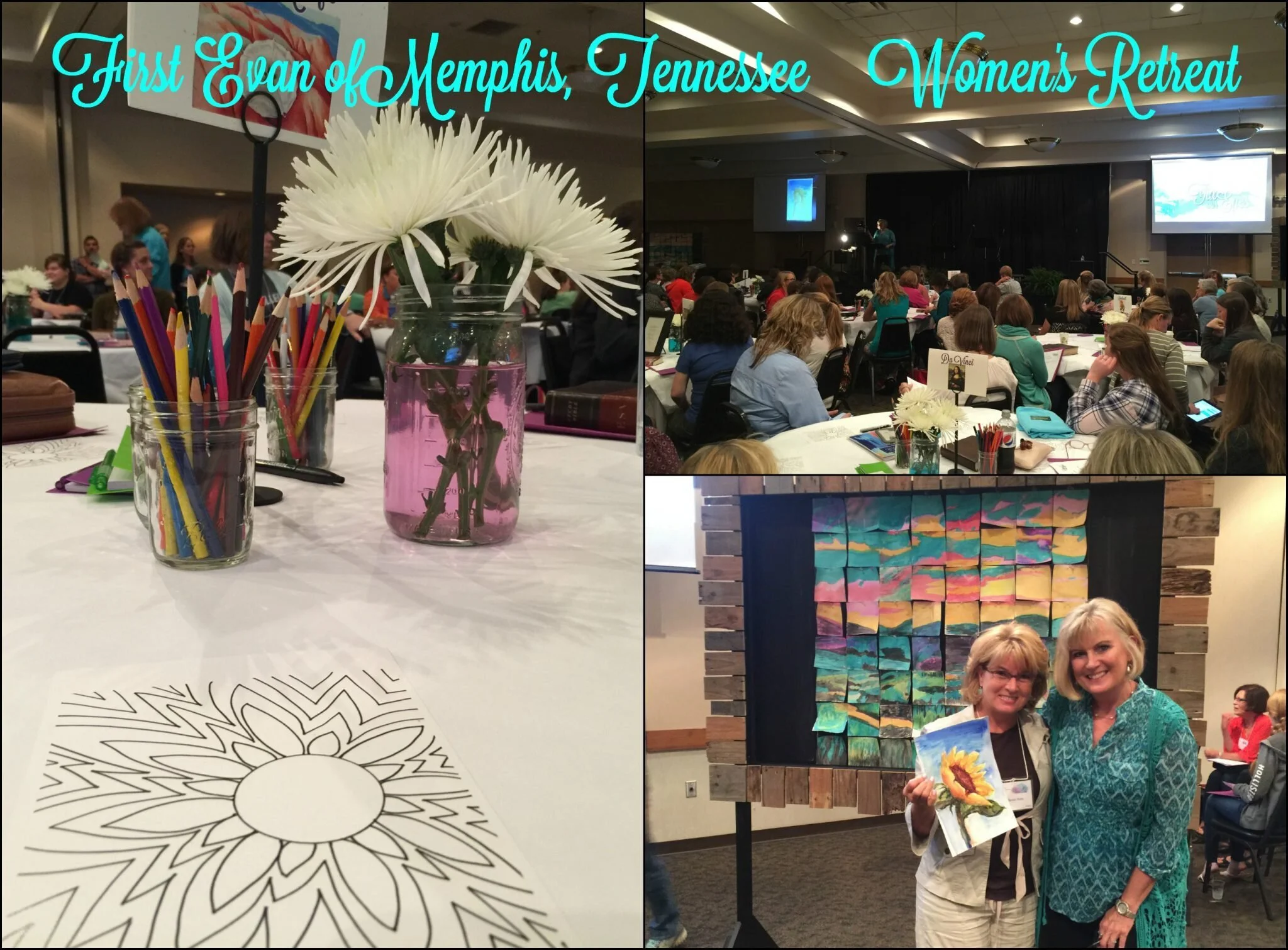 L) Colored pencils and a little contemplative coloring sheet I created to connect to the weekend’s message. (Top R) Wonderful FEM women in the lovely retreat facility of Pickwick State Park. (There was a Bass Tournament in the meeting room next door!) (Bottom R) Winner of my painting giveaway! We’re standing in front of the “large group masterpiece” art activity everyone took part in on Friday night. I was highly impressed with this cool art idea!!!